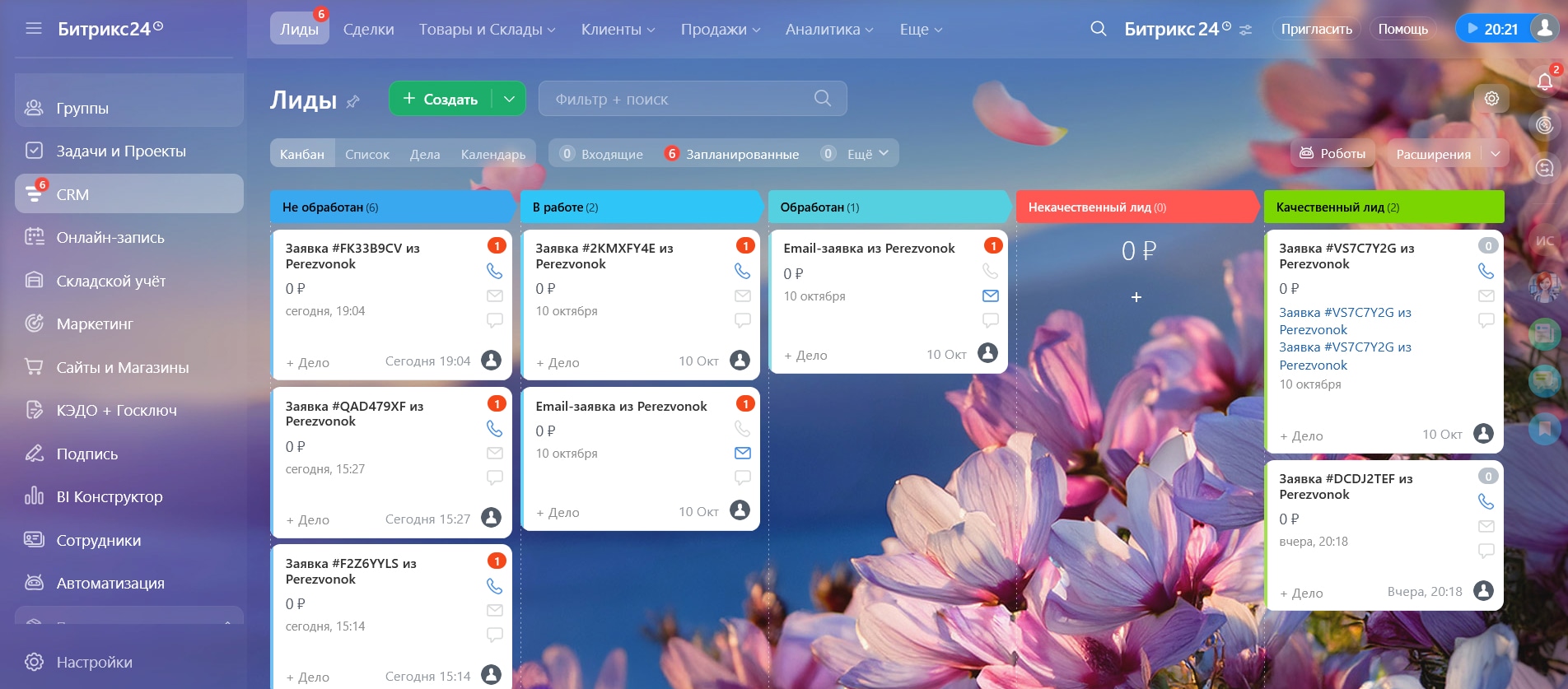 Интеграция максимально простая (через входящий вебхук) и позволяет получать информацию о заявках из виджета Perezvonok с ваших сайтов. Данные о состоявшихся звонках и отправленных email-заявках будут автоматически добавляться в CRM в качестве лидов и задач на их обработку. На обработку лида типа «звонок» в задаче выделено 3 минуты, а на email-заявку 15 минут.