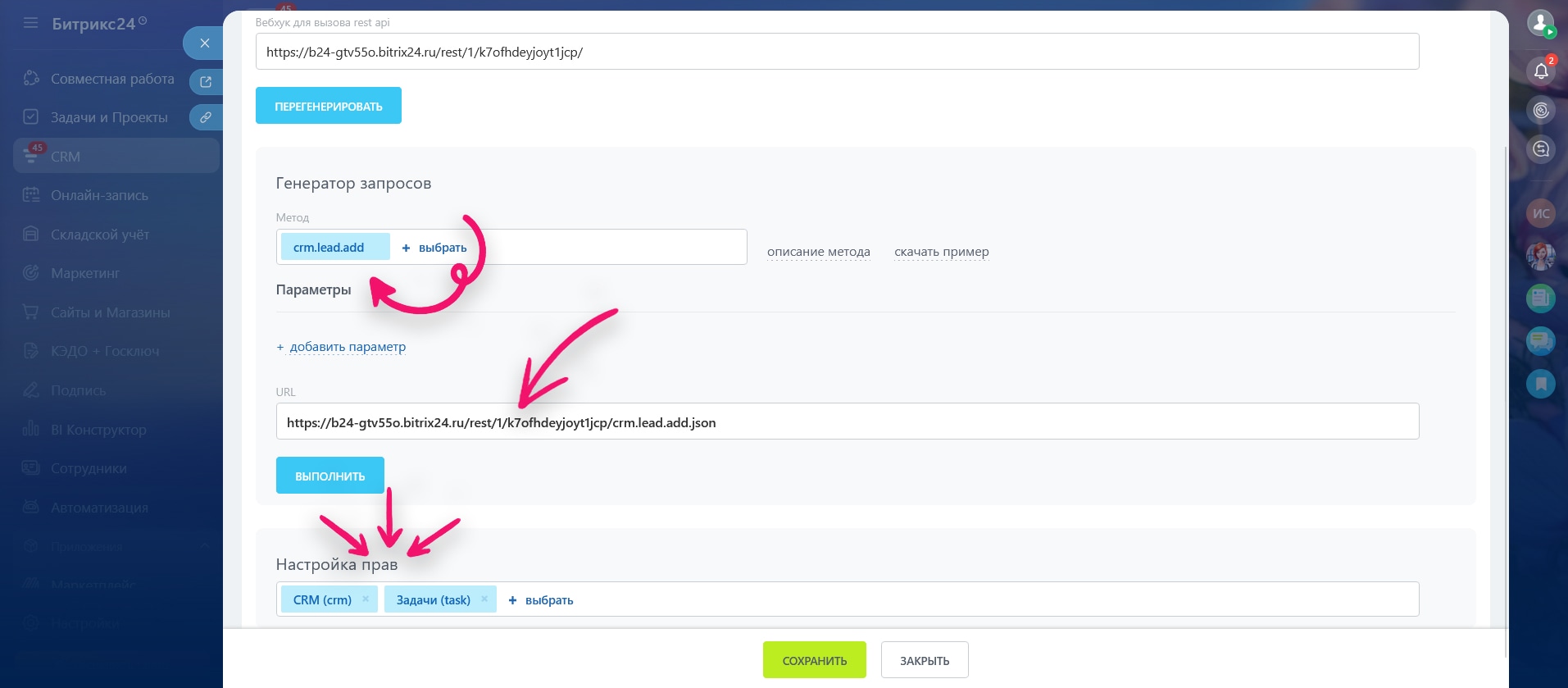 1.4. В настройках входящего вебхука нужно установить метод crm.lead.add, а в настройках прав установить CRM и Задачи (task). Обратите внимание, что именно task, а не tasks. Скопируйте URL вебхука (там где написано crm.lead.add.json в конце) и нажмите кнопку «Сохранить».