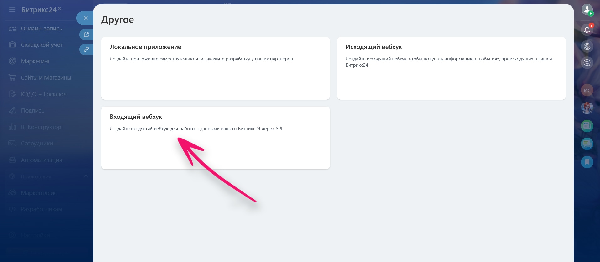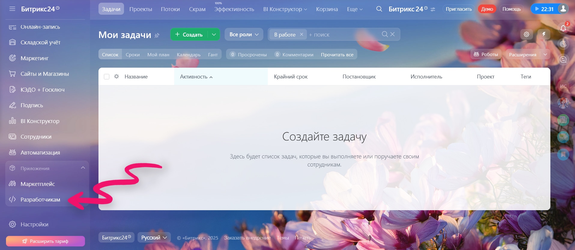 1.1. Зайдите в личный кабинет Битрикс24. В левом меню разверните раздел «Приложения», и нажмите на ссылку «Разработчикам».