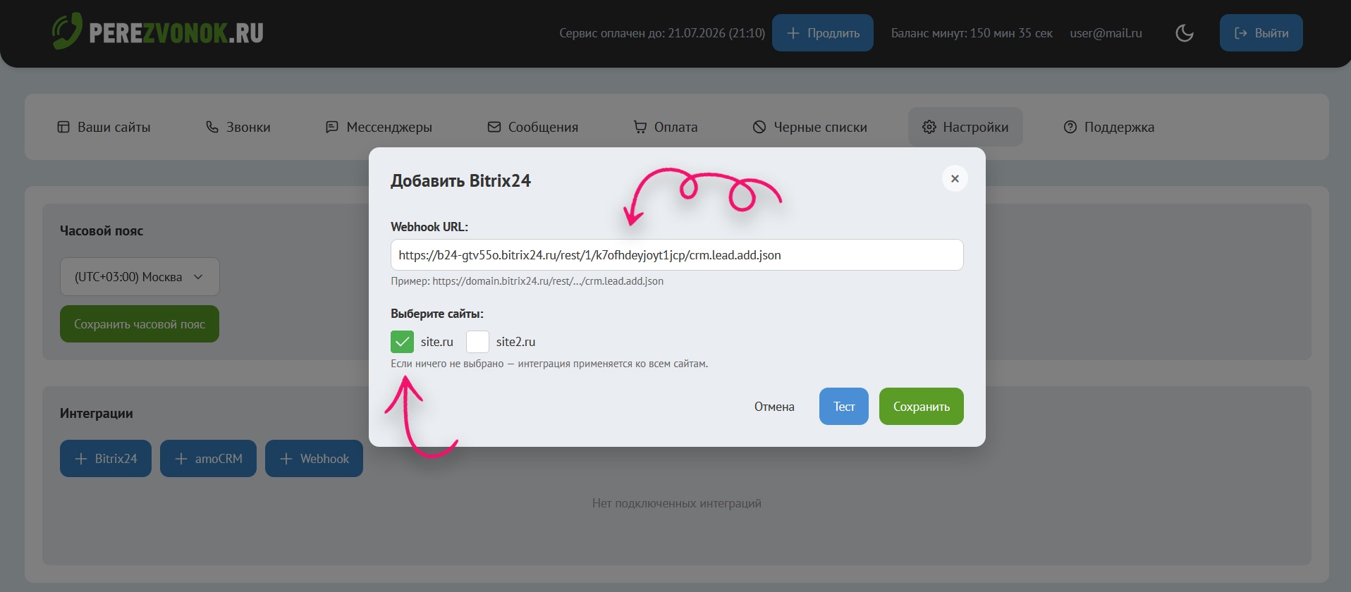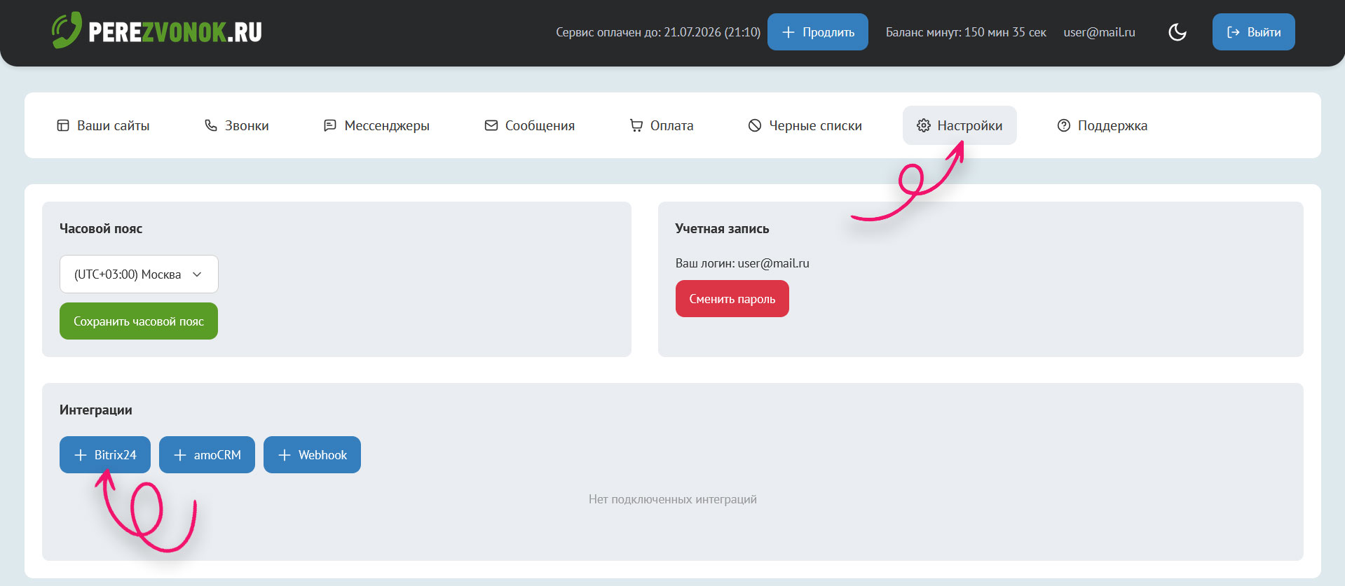 2.1. Войдите в личный кабинет Perezvonok.ru и перейдите на страницу «Настройки». В блоке «Интеграции» выберите «Битрикс24».